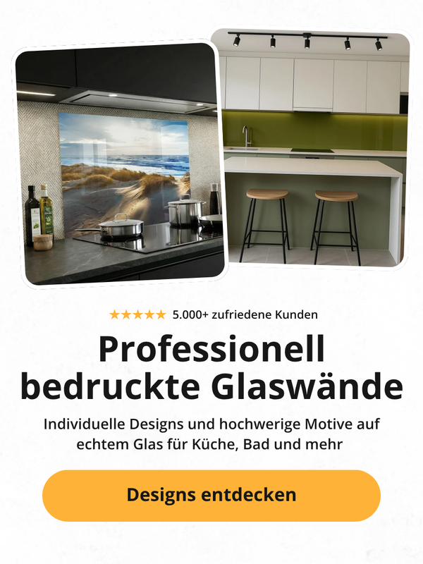 Verleihen Sie Ihren Räumen Persönlichkeit und Stil: Bei uns erhalten Sie individuelle Rückwände aus hochwertigem Sicherheitsglas, die nicht nur optisch beeindrucken, sondern auch durch Langlebigkeit und Qualität überzeugen. Ob für die Küche oder das Bad – wir fertigen Ihre Rückwand nach Wunschmaß, in Ihrer Lieblingsfarbe oder mit einem ganz persönlichen Wunschmotiv – direkt in der eigenen Glas-Manufaktur made in Germany und sicherer Lieferung!